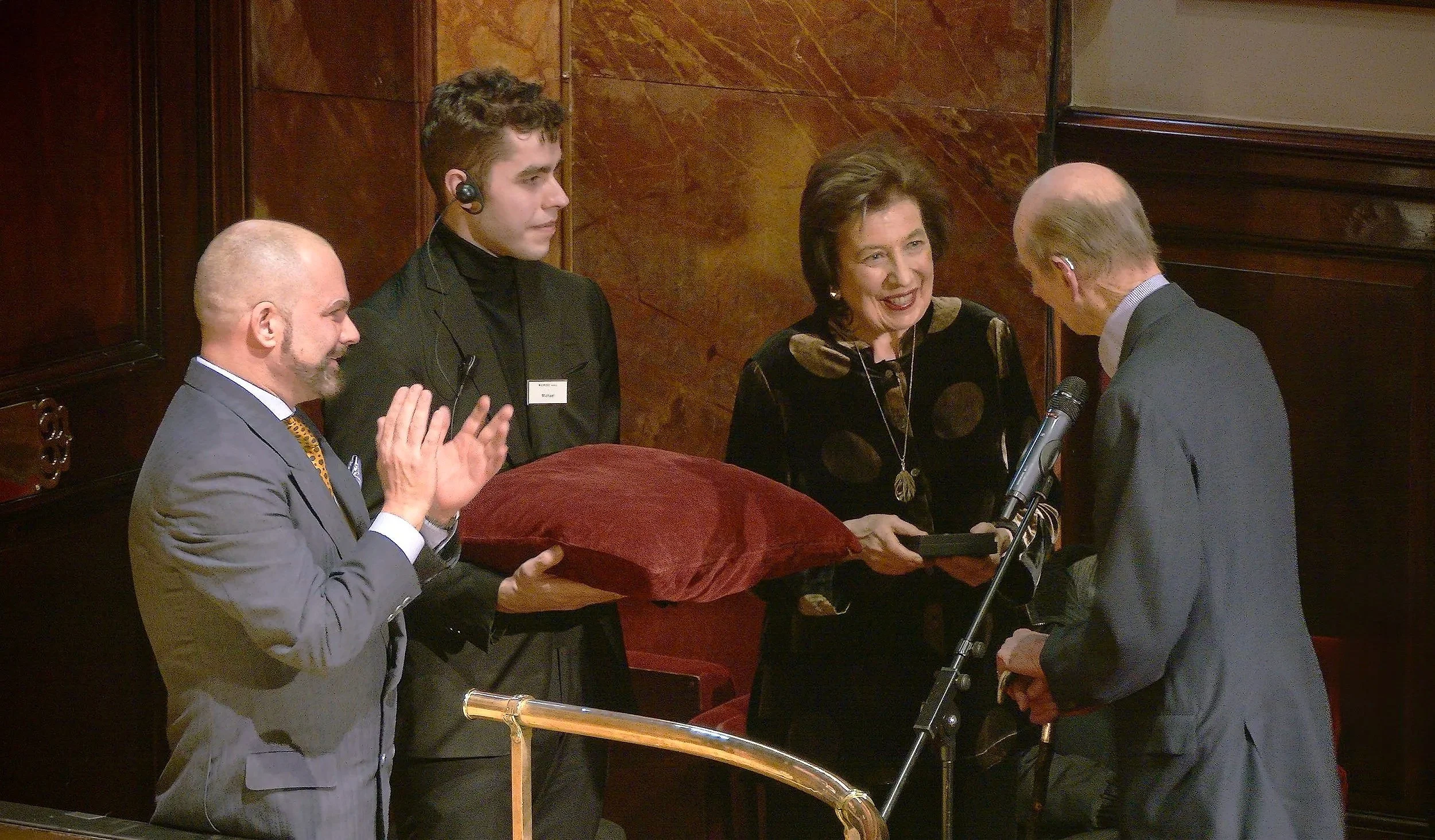 Imogen with John Gilhooly (left), Executive Director of Wigmore Hall, receiving the medal from HRH The Duke of Kent (right).